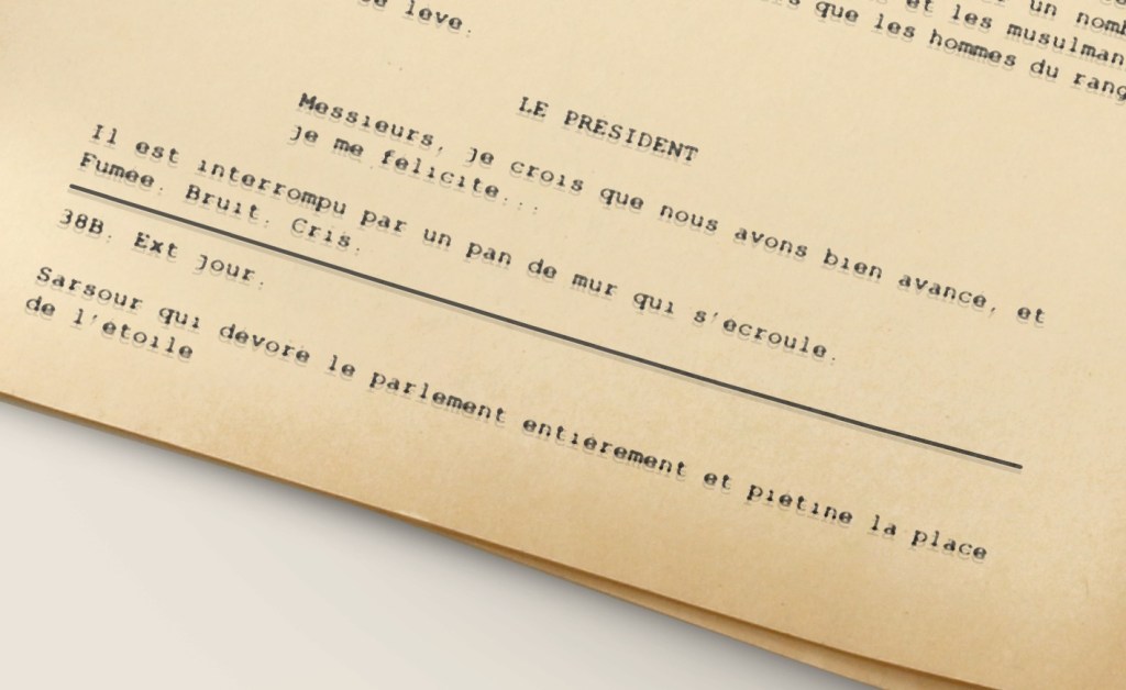 « 38B. Extérieur Jour. Sarsour qui dévore le parlement entièrement et piétine la place de l’étoile »